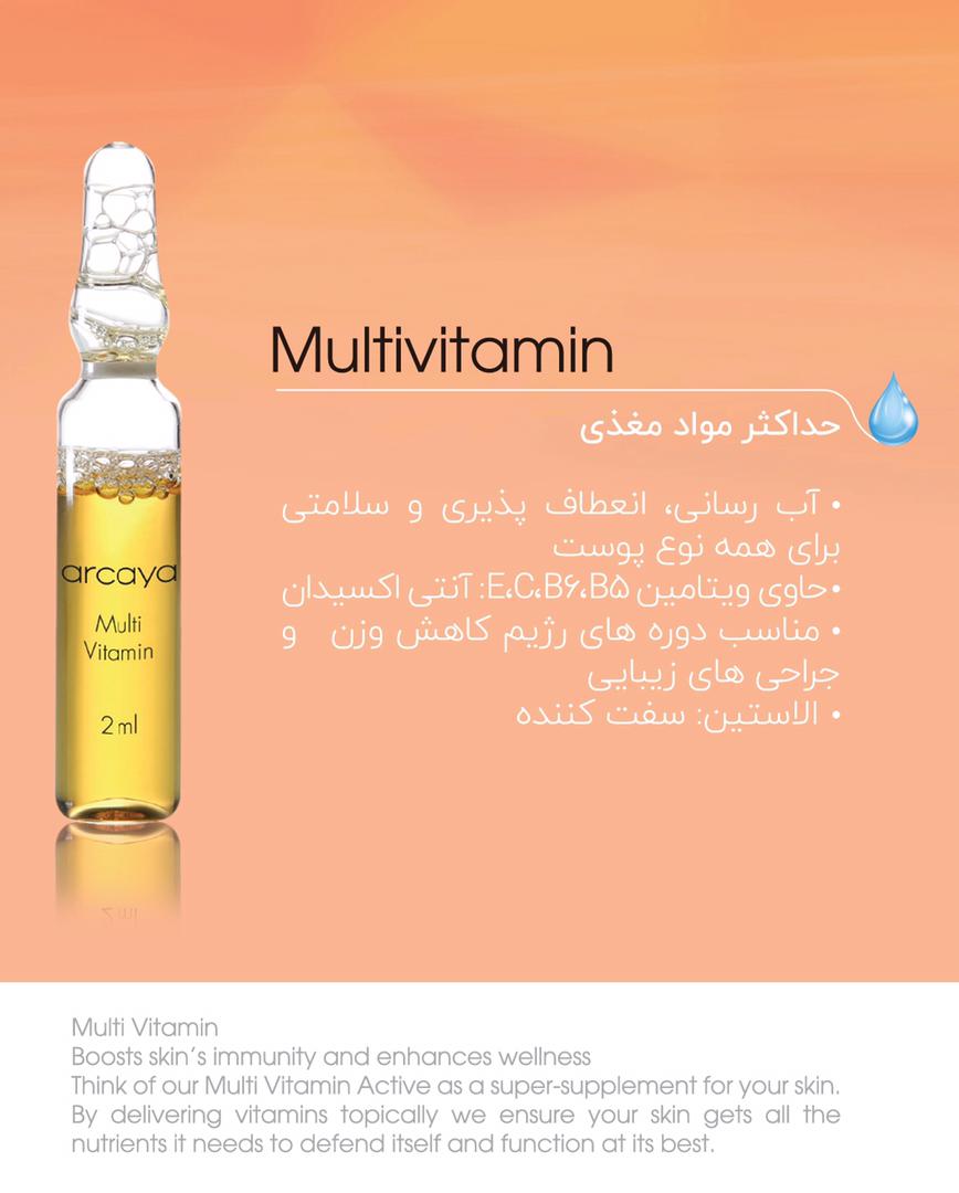 سرم مواد مغذي آرکايا مولتي ويتامين Arcaya Multivitamin آب رساني قوي پوست بوده و با تغذيه و بازسازي پوست، انعطاف پذيري و سلامتي براي همه نوع پوست به ارمغان مي آورد. سرم مولتي ويتامين آرکايا حاوي ويتامين E,C,B6,B5 مي باشد و همچنين براي بازسازي پوست پس از دوره هاي رژيم کاهش وزن و جراحي هاي زيبايي مناسب است.