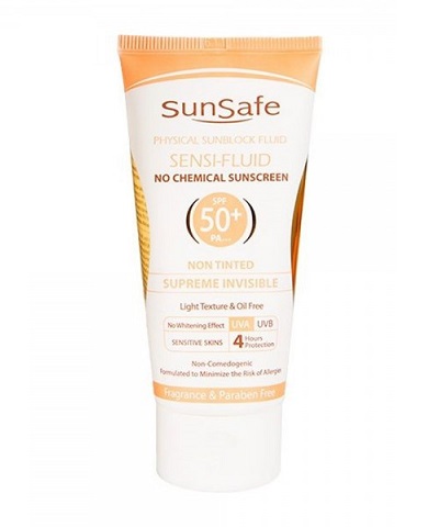 توليد ضد آفتاب سنسي فلوئيد +SPF50 سان سيف، عصر جديدي در حفاظت پوست در برابر درماتولوژي به شمار ميرود. اين ضد آفتاب فلوئيد حفاظت وسيعي در برابر اشعه‌هاي UVA1 UVA2 و UVB ايجاد مي‌کند که به واسطه ميکروتيتانيوم دي اکسيد، يک سپر دفاعي براي پيشگيري آسيب اشعه‌هاي خورشيد ايجاد مي‌کند. ضد آفتاب سنسي فلوئيد، حفاظت وسيعي در برابر اشعه‌هاي UVA و UVB ايجاد مي‌نمايد. کمپلکس ويتامين E+B3 و چاي سبز، از آسيب DNA پوست در اثر خورشيد جلوگيري مي‌کند. اين محصول بر پايه سيستم نوين Water Gel فرموله شده است و در نتيجه فاقد امولسيفاير است.