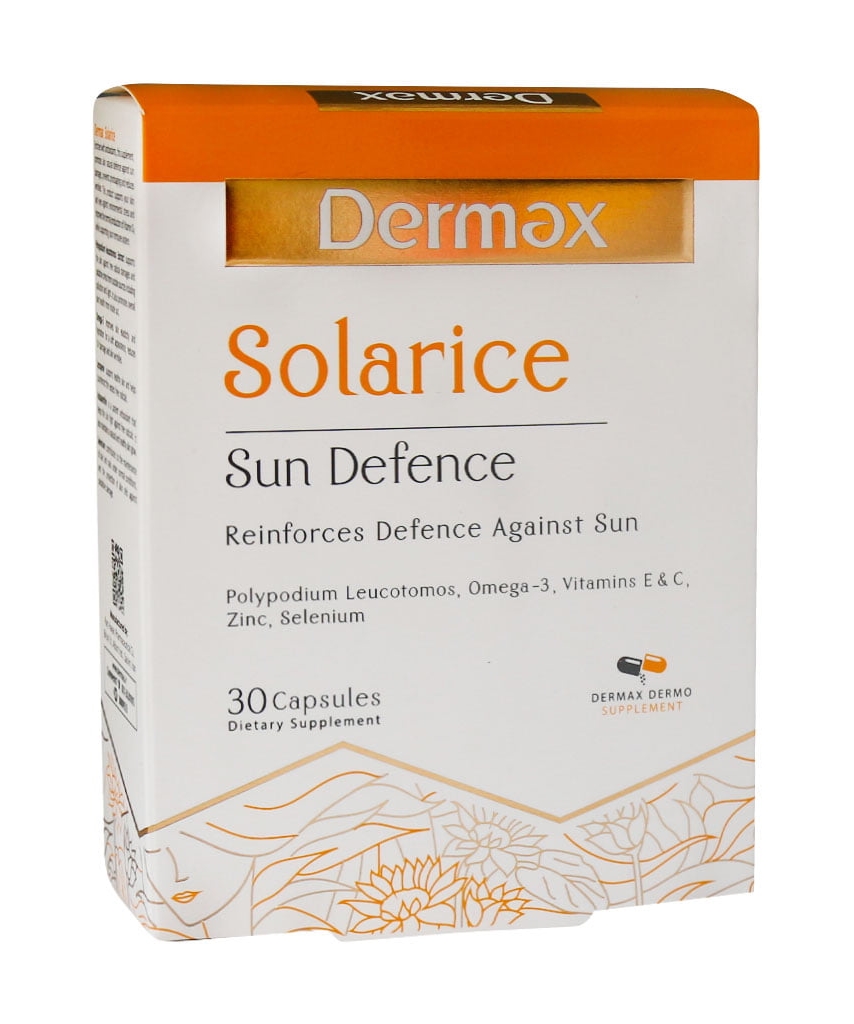 مکمل تغذيه اي درمکس سولاريس، محافظ پوست و چشم ها در برابر نور خورشيد مي باشد و ترکيب منحصر بفردي از آنتي اکسيدان هاي طبيعي، جهت کمک به محافظت و سلامت بدن بخصوص پوست و چشم ها در برابر اشعه مخرب و مضر نور خورشيد مي باشد. اين فرآورده علاوه بر کمک به حفظ جواني پوست، در کمک به توليد ويتامين D3 طبيعي و تقويت سيستم ايمني بدن در برابر راديکال هاي آزاد نيز تاثير بسزايي دارد.