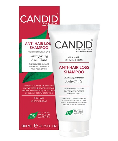 شامپو ضد ريزش موي چرب کانديد با کاهش هورموني به نام DHT که عامل موثر ريزش مو است و مهار آنزيم 5 آلفا-ردوکتاز موجب کاهش ريزش مو در آقايان و خانم‌ها مي‌شود. شامپو تقويتي کانديد علاوه بر افزايش گردش خون پوست سر جهت تقويت رشد مو، با تنظيم ترشح سبوم موجب کاهش چربي پوست سر و مو مي‌شود. به علت فرمولاسيون فاقد سولفات، اين شامپو رنگ و رطوبت موها را حفظ مي‌نمايد. در ضمن با دارا بودن عوامل محافظ در برابر حرارت، در زمان خشک کردن مو با سشوار از مو محافظت مي‌کند.