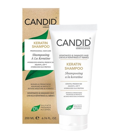 شامپو کراتينه کانديد مناسب مو کراتينه و آسيب ديده بوده که با فرمولاسيون تحت ليسانس فرانسه توانسته نظر مشتريان خود را جلب کند. اين شامپو ضمن حفظ لايه چربي محافظ مو و پوست سر، آلودگي را به ملايمت پاک ميکند. به دليل غني بودن از کراتين هيدروليز شده، عوامل آبرسان و مغذي ضمن از بين بردن وز مو و محافظت در برابر آسيبهاي حرارتي ناشي از وسايل حالت دهنده مو مثل اتو و سشوار به ترميم و استحکام موي خشک و کراتينه شده کمک ميکند. همچنين با داشتن خواص آنتي اکسيداني و نرم کننده به لطافت و درخشندگي موهاي شما کمک ميکند.