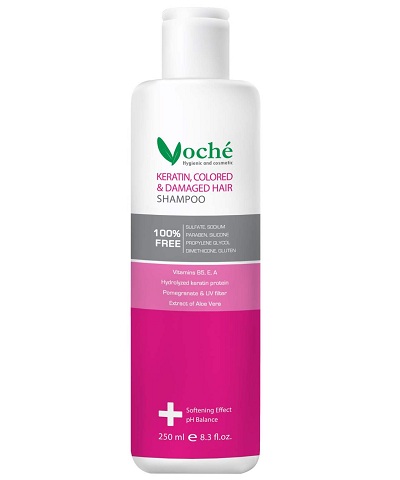 شامپو مناسب موهاي کراتين شده، آسيب ديده و رنگ شده داراي فرمولاسيون اختصاصي جهت حفظ رنگ و کاهش اثرات مخرب دکلره و رنگ مو مي باشد. اين شامپو به کمک کراتين موجود در آن مو را آبرساني کرده و ساقه مو را بازسازي ميکند. اين شامپو به کمک ويتامين هاي بيوتينA ،E و B5 به کاهش ريزش مو و تقويت فوليکولها کمک ميکند. اين شامپو به کمک فيلتر UV و عصاره انار اثرات مضر نور خورشيد را کاهش داده و به تثبيت رنگ مو کمک ميکند. اين شامپو فاقد مواد مضر سولفات، ، پارابن ، سيليکون، گلوتن، پروپيلن گليکول، دايمتيکون و نمک مي باشد. به ميزان کافي از شامپو را بر روي کف سر و ساقه موهاي کراتينه و رنگ شده بماليد و پس از چند دقيقه با نوک انگشتان ماساژ دهيد و سپس آبکشي نماييد. در اين شامپو براي حفظ رطوبت ساقه مو و پوست سر سولفات حذف شده است. شامپو هاي فاقد سولفات داراي کف کمتر و شويندگي بيشتر مي باشند.