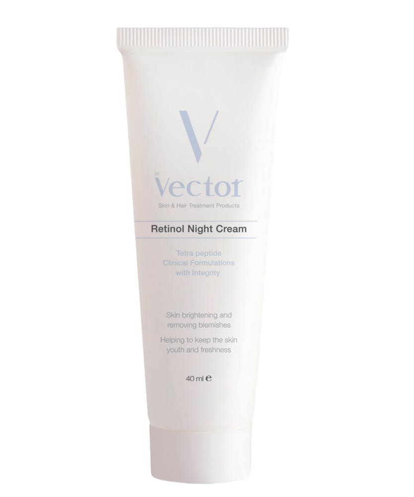 کرم شب رتينول وکتور، حاوي يکي از ترکيبات قوي ضد پيري و يکي از مشتقات ويتامين A، رتينول است که در روشن سازي پوست و تحريک ساخت کلاژن موثر بوده و موجب شفافيت و درخشندگي آن ميشود. اين کرم شب، در رفع تيرگي پوست ناشي از نور خورشيد و افزايش سن و روشنسازي پوست، کاهش چين و چروک هاي پوستي و افزايش خاصيت ارتجاعي پوست موثر است.