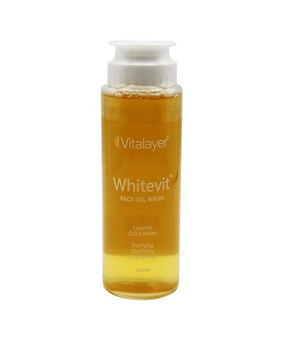ژل پاک کننده صورت وايت ويت Vitalayer، حاوي عصاره شيرين بيان و کافئين بوده و مناسب به عنوان مکمل درمان انواع لکهاي پوست ارائه شده است. اين ژل علاوه بر پاکسازي عميق منافذ پوست از آلودگي، فرآيند شفافسازي پوست را بهبود ميبخشد. همچنين اين محصول به دليل داشتن ترکيبات موثر باعث رفع علائم کدري پوست و روشن شدن پوست ميشود.