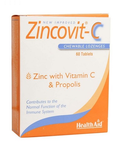قرص جويدني و مکيدني Zincovit-C کمپاني Health Aid ترکيبي ويژه و مؤثر در بهبود عملکرد سيستم ايمني و تقويت آن مي باشد. اين ترکيب منحصر به فرد حاوي ويتامين C، روي و عصاره پروپوليس (Propolis Extract) است که مي تواند با افزايش و تقويت سيستم ايمني در پيشگيري از انواع آلرژي ها به ويژه در فصل بهار و انواع بيماري ها مانند سرماخوردگي، آنفلوانزا و گلو درد به ويژه در فصل زمستان مفيد و مؤثر باشد.