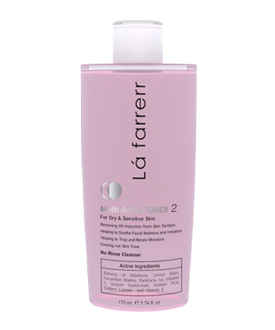 تونر مولتي اکتيو لافارر مخصوص پوستهاي خشک و حساس حاوي عصاره پيچک، عصاره خيار، عصاره مليسا، عصاره پاريتاريا، عصاره اِلدربري، عصاره پنيرک، سديم لاکتات، Na-PCA، سديم هيالورونات و ويتامين E و C است که علاوه بر کاهش التهابات و حساسيتهاي پوستي شما، سبب رطوبت رساني، کاهش سايز منافذ باز و پاکسازي آنها ميشود.